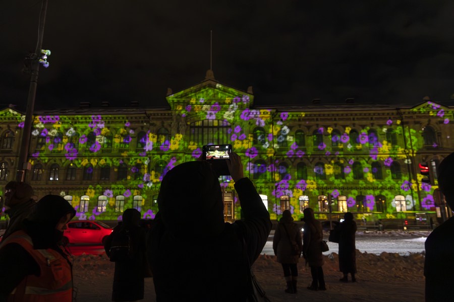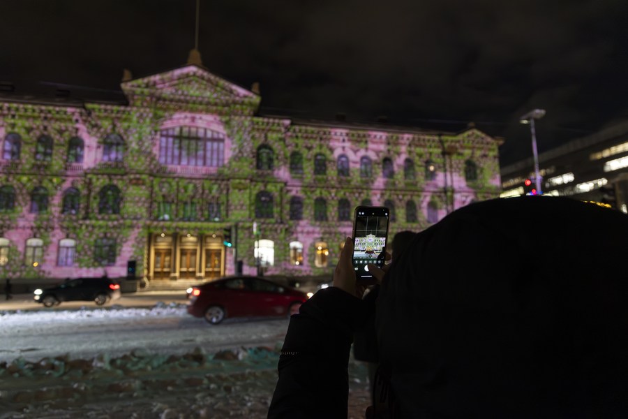 A person takes photos of the illuminated Ateneum Art Museum during the Lux Helsinki light festival in Helsinki, Finland, on Jan. 3, 2024. (Photo by Matti Matikainen/Xinhua)