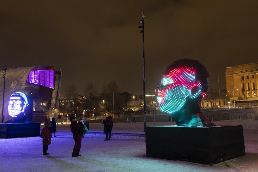 People look at an illuminated installation during the Lux Helsinki light festival in Helsinki, Finland, on Jan. 3, 2024. (Photo by Matti Matikainen/Xinhua)