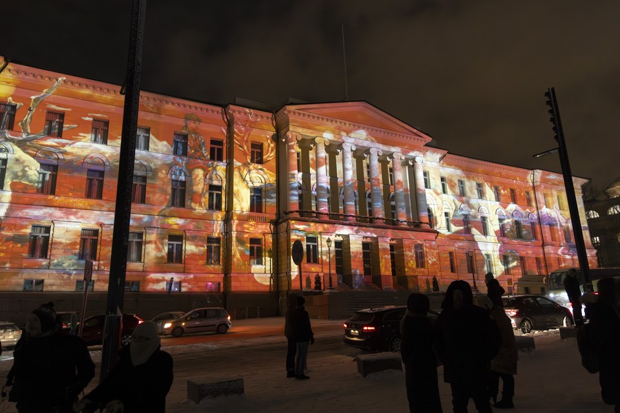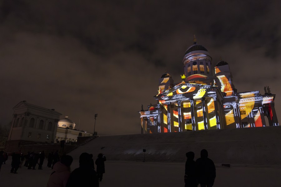 A buildings in Senate Square is illuminated during the Lux Helsinki light festival in Helsinki, Finland, on Jan. 3, 2024. (Photo by Matti Matikainen/Xinhua)