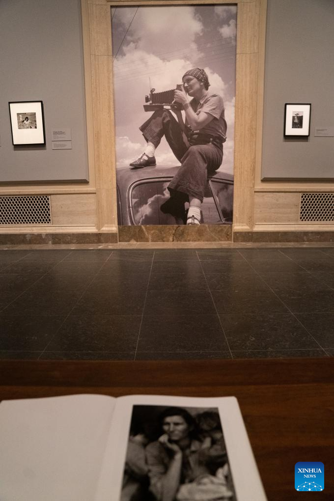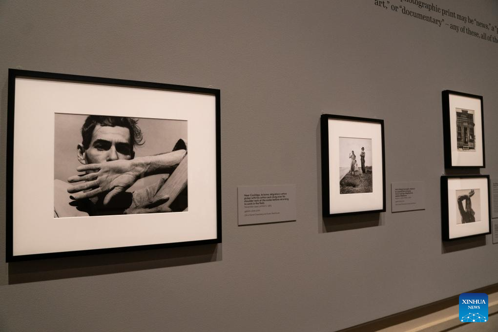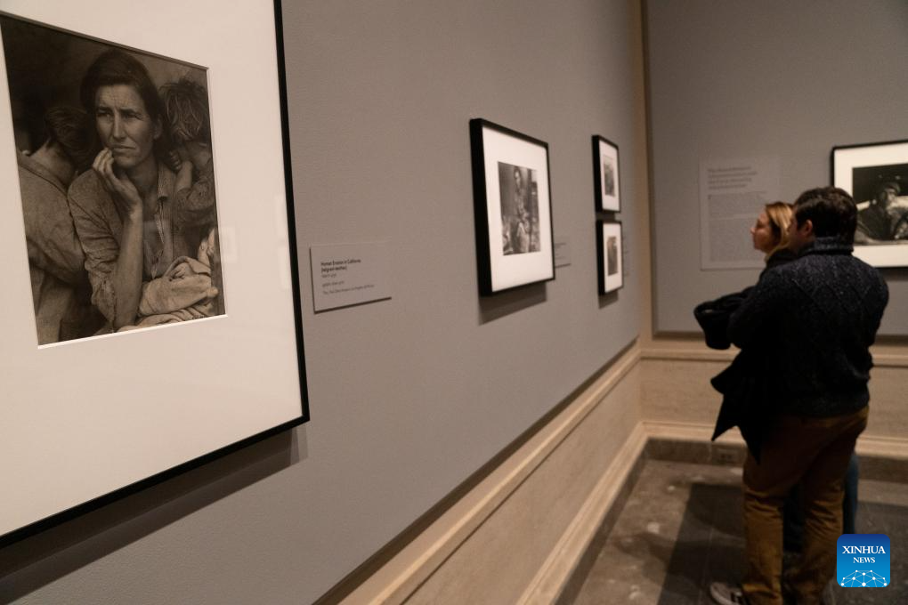 Photo taken on Jan. 3, 2024 shows Dorothea Lange's artworks at the exhibition Dorothea Lange: Seeing People at the National Gallery of Art in Washington, D.C., the United States. Featuring some 100 photographs, the exhibition Dorothea Lange: Seeing People addresses Lange's innovative approaches to picturing people, emphasizing her work on social issues including economic disparity, migration, poverty, and racism. (Xinhua/Liu Jie)