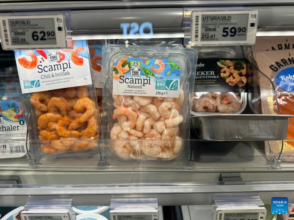 This photo taken on Jan. 4, 2024 shows shrimps being sold in a supermarket in Oslo, capital of Norway. Norway's seafood exports soared to unprecedented heights in 2023, achieving a record value of 172 billion Norwegian kroner (16.68 billion U.S. dollars). (Photo by Chen Yaqin/Xinhua)
