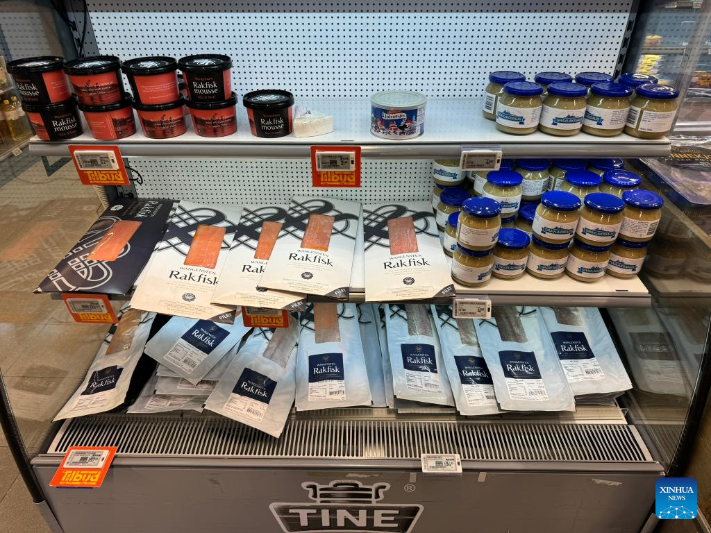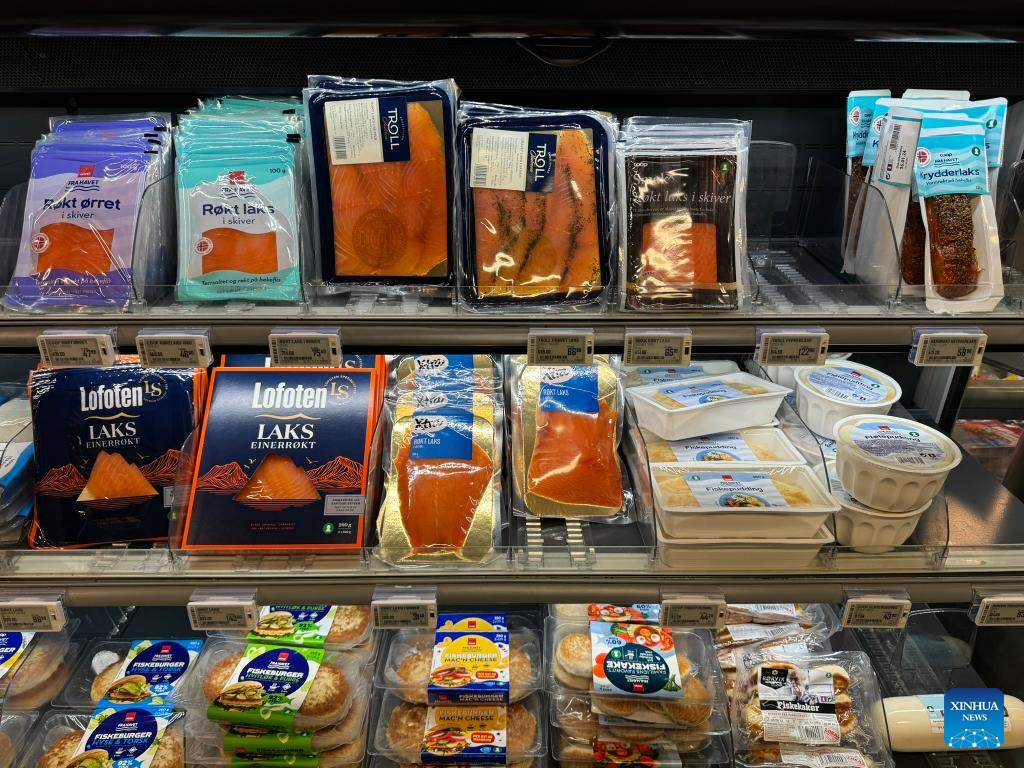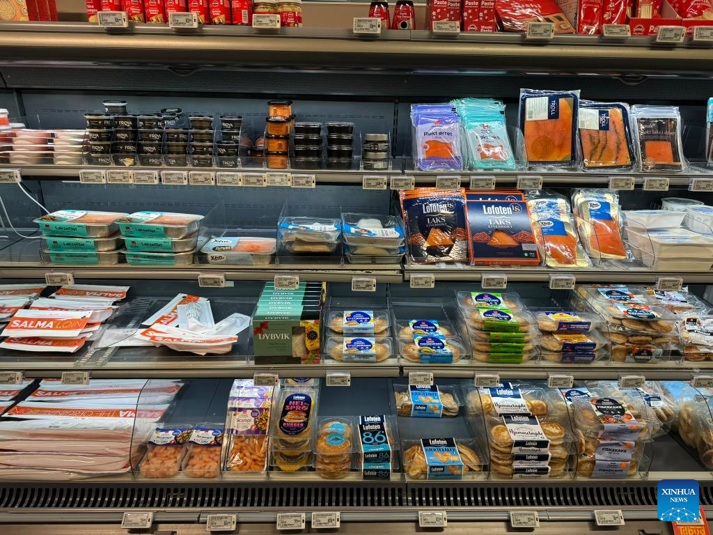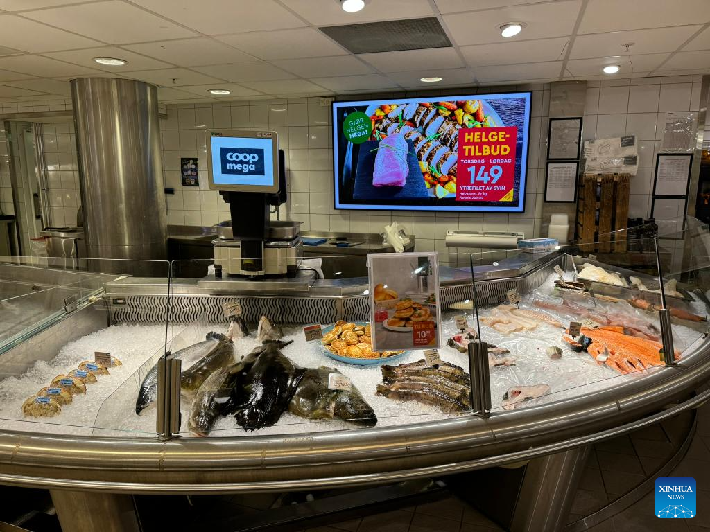 This photo taken on Jan. 4, 2024 shows seafood being sold in a supermarket in Oslo, capital of Norway. Norway's seafood exports soared to unprecedented heights in 2023, achieving a record value of 172 billion Norwegian kroner (16.68 billion U.S. dollars). (Photo by Chen Yaqin/Xinhua)