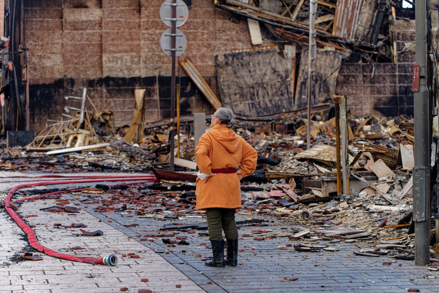 A citizen looks at the rubble of a renowned morning market in Wajima city of the central Japanese prefecture of Ishikawa, Jan. 4, 2024. The morning market was gutted by a large blaze, engulfing over 200 structures in the central Wajima area. (Xinhua/Zhang Xiaoyu)