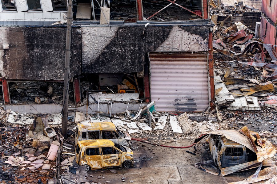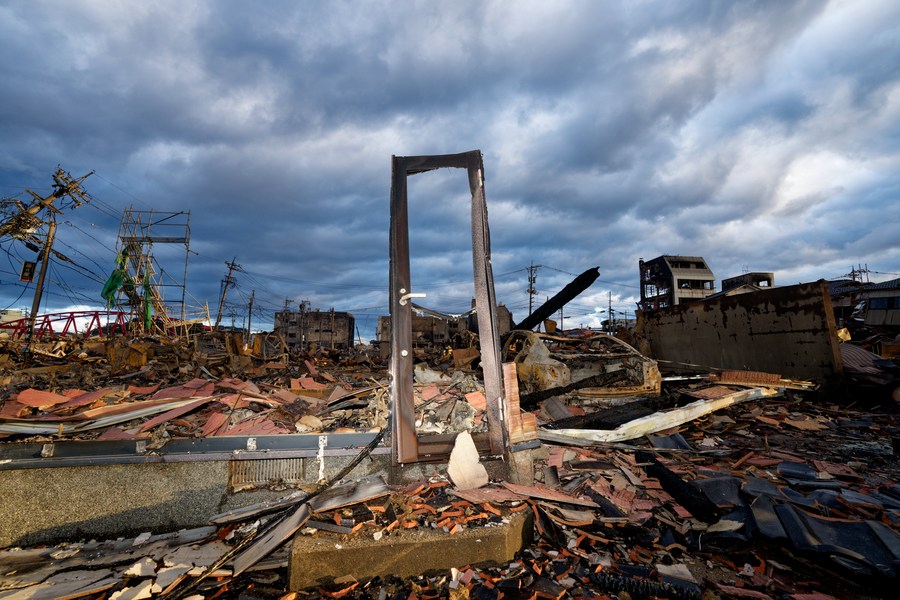 This photo taken on Jan. 4, 2024 shows rubble of a renowned morning market in Wajima city of the central Japanese prefecture of Ishikawa. The morning market was gutted by a large blaze, engulfing over 200 structures in the central Wajima area. (Xinhua/Zhang Xiaoyu)