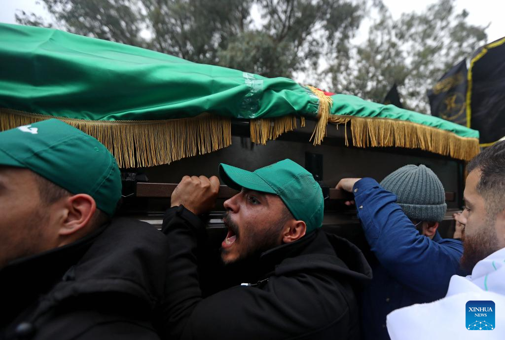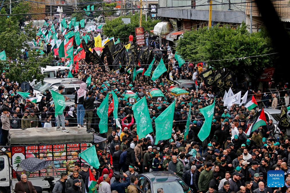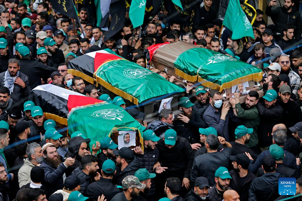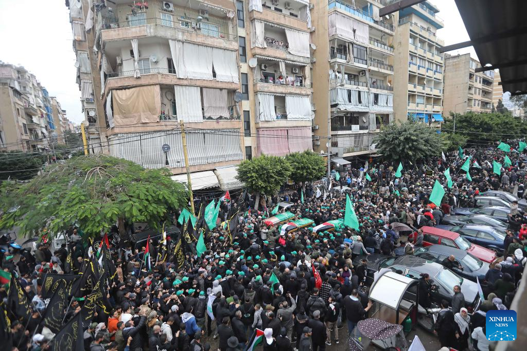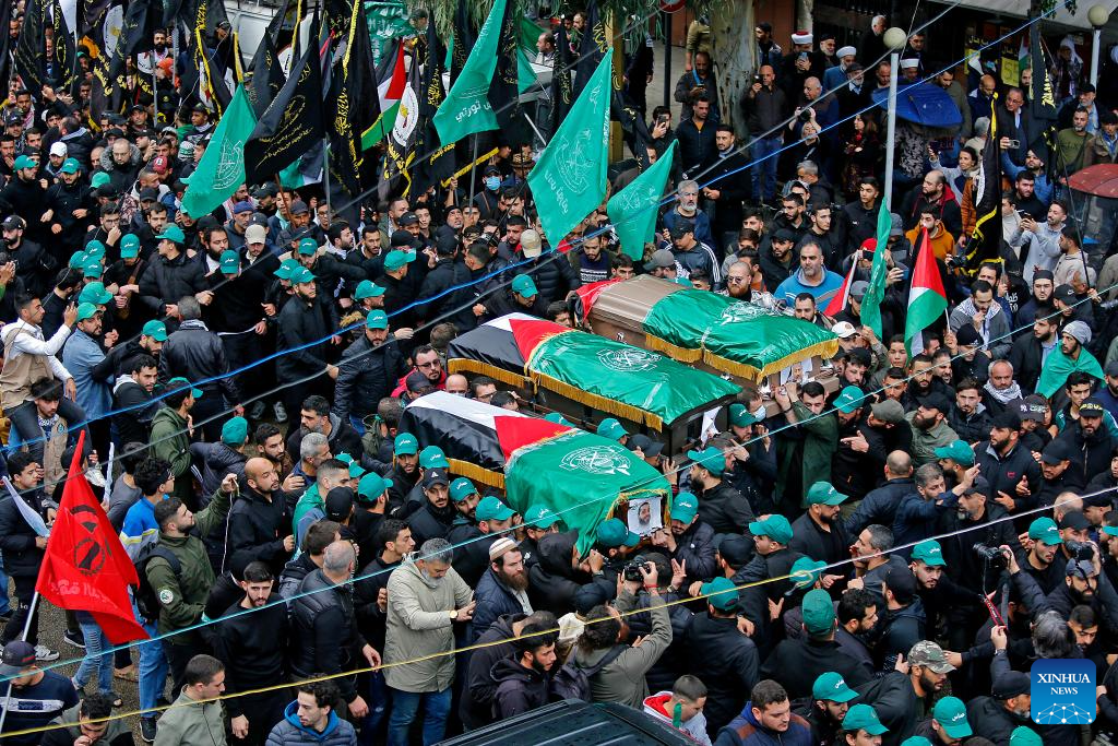 People attend the funeral of Saleh al-Arouri, Hamas' deputy chief, and other two Hamas officials, in Beirut, Lebanon, on Jan. 4, 2024. Hezbollah leader Sayyed Hassan Nasrallah warned on Wednesday night to attack Israel "without restraint" if Israel expands its attacks against Lebanon, local TV channel al-Manar reported. (Xinhua/Bilal Jawich)