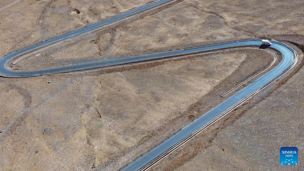 This aerial photo taken on Jan. 5, 2024 shows a truck loaded with fresh fruits and vegetables running on a mountain road toward the remote Beiga No.4 Village, 150 kilometers away from Xainza County, southwest China's Xizang Autonomous Region. The Xainza County in Nagqu City, southwest China's Xizang Autonomous Region, situated at an average elevation of 4,700 meters. Traditionally, local herders' diet relies on meat and tea, lacking fruits and vegetables.