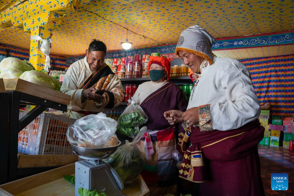 Sherab Gyatso (1st R), a store manager, weighs vegetables for a villager at a direct sales store in the remote Beiga No.4 Village in Xainza County, southwest China's Xizang Autonomous Region, Jan. 5, 2024. The Xainza County in Nagqu City, southwest China's Xizang Autonomous Region, situated at an average elevation of 4,700 meters. Traditionally, local herders' diet relies on meat and tea, lacking fruits and vegetables.