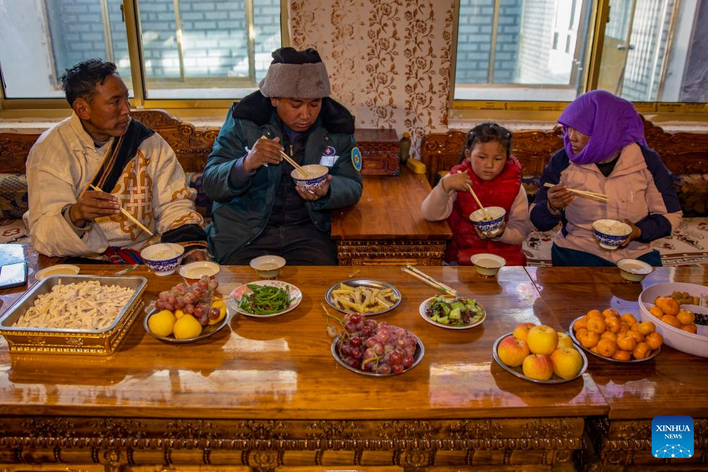 Villager Tsering Chodar (1st L) has dinner at home in the remote Beiga No.4 Village in Xainza County, southwest China's Xizang Autonomous Region, Jan. 5, 2024. The fruits and vegetables on the table were all purchased at the direct sales store in the village after being delivered there by Xainza County's Supply and Marketing Cooperative on the same day. The Xainza County in Nagqu City, southwest China's Xizang Autonomous Region, situated at an average elevation of 4,700 meters. Traditionally, local herders' diet relies on meat and tea, lacking fruits and vegetables.