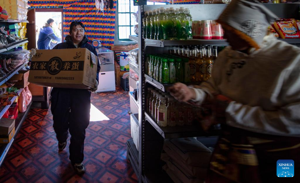 Tsering Samdrup, a distributor of Xainza County's Supply and Marketing Cooperative, prepares goods to be delivered to a direct sales store in the remote Beiga No.4 Village, at the central store in Xainza County, southwest China's Xizang Autonomous Region, Jan. 5, 2024. The Xainza County in Nagqu City, southwest China's Xizang Autonomous Region, situated at an average elevation of 4,700 meters. Traditionally, local herders' diet relies on meat and tea, lacking fruits and vegetables.