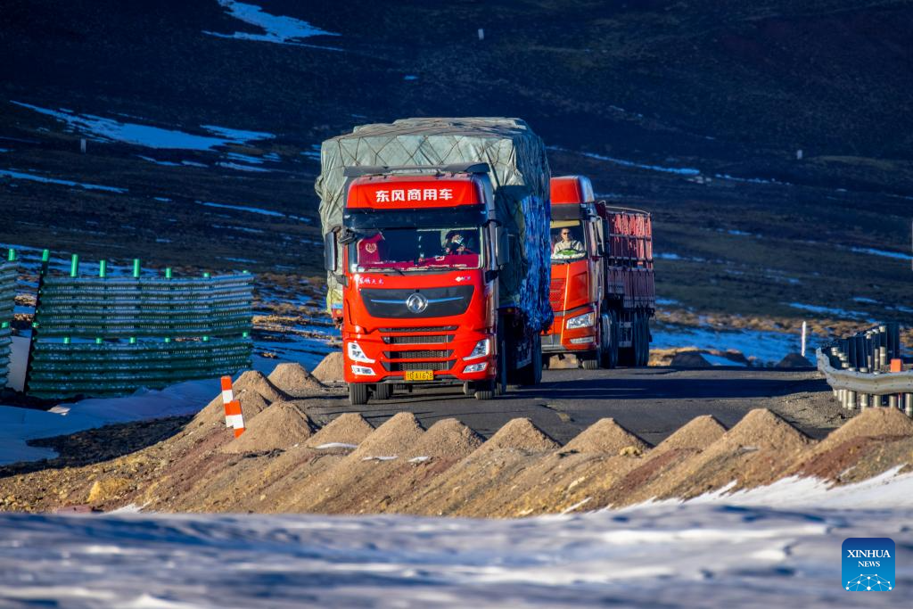 Trucks loaded with 50 tonnes of fresh fruits and vegetables purchased from Xining City of northwest China's Qinghai Province pass through the Tanggula Mountain pass in southwest China's Xizang Autonomous Region, Jan. 3, 2024. The Xainza County in Nagqu City, southwest China's Xizang Autonomous Region, situated at an average elevation of 4,700 meters. Traditionally, local herders' diet relies on meat and tea, lacking fruits and vegetables.