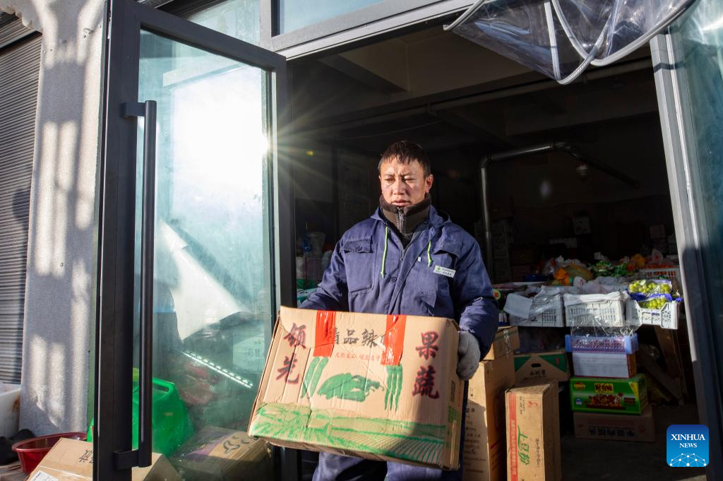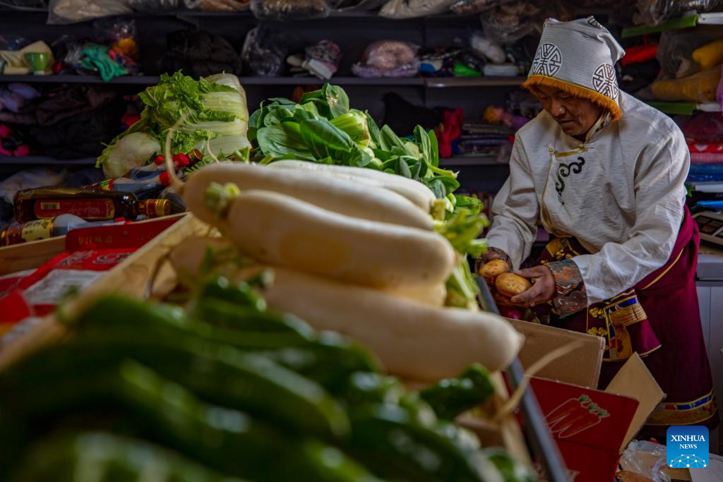 Sherab Gyatso, a store manager, sorts out vegetables delivered here by Xainza County's Supply and Marketing Cooperative at a direct sales store in the remote Beiga No.4 Village in Xainza County, southwest China's Xizang Autonomous Region, Jan. 5, 2024. The Xainza County in Nagqu City, southwest China's Xizang Autonomous Region, situated at an average elevation of 4,700 meters. Traditionally, local herders' diet relies on meat and tea, lacking fruits and vegetables.