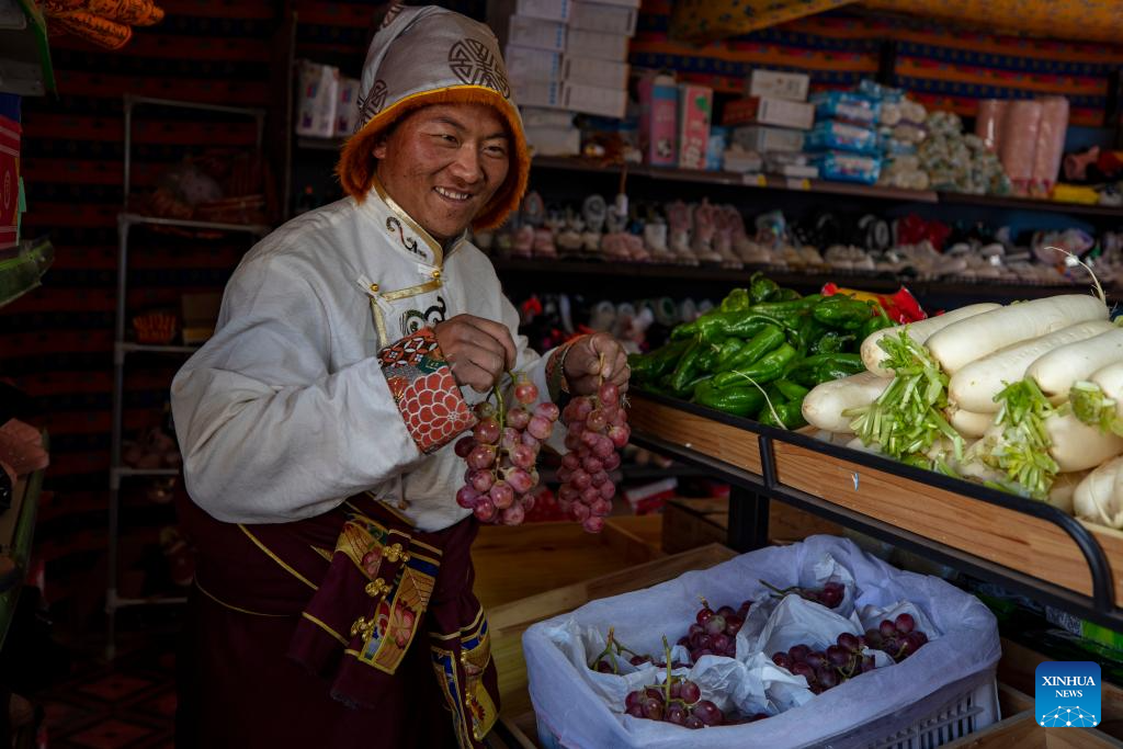 Sherab Gyatso, a store manager, sorts out grapes delivered here by Xainza County's Supply and Marketing Cooperative at a direct sales store in the remote Beiga No.4 Village in Xainza County, southwest China's Xizang Autonomous Region, Jan. 5, 2024. The Xainza County in Nagqu City, southwest China's Xizang Autonomous Region, situated at an average elevation of 4,700 meters. Traditionally, local herders' diet relies on meat and tea, lacking fruits and vegetables.