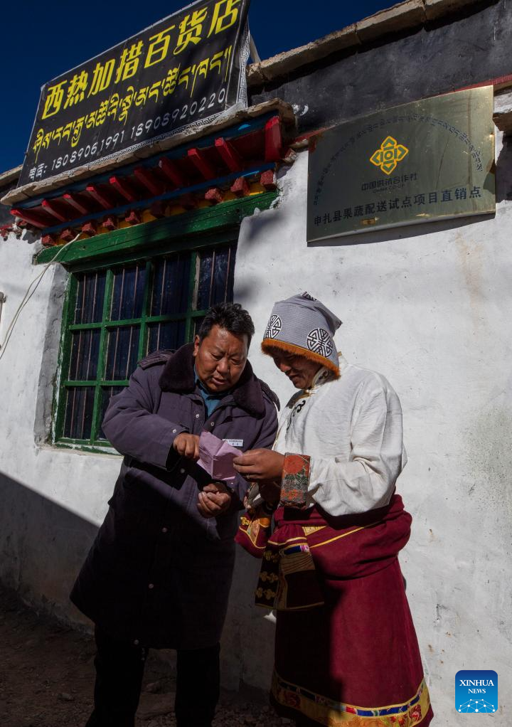Store manager Sherab Gyatso (R) and Wuwa, distribution manager of Xainza County's Supply and Marketing Cooperative, check the delivery list at a direct sales store in the remote Beiga No.4 Village in Xainza County, southwest China's Xizang Autonomous Region, Jan. 5, 2024. The Xainza County in Nagqu City, southwest China's Xizang Autonomous Region, situated at an average elevation of 4,700 meters. Traditionally, local herders' diet relies on meat and tea, lacking fruits and vegetables.