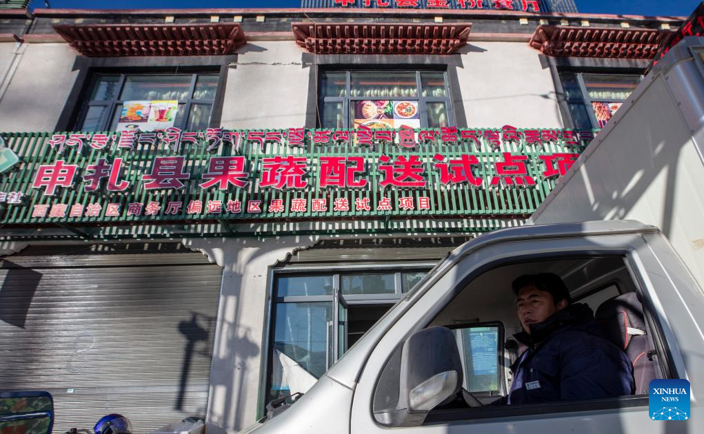 Bara, a distributor of Xainza County's Supply and Marketing Cooperative, prepares to deliver goods to a direct sales store in the remote Beiga No.4 Village, from the central store in Xainza County, southwest China's Xizang Autonomous Region, Jan. 5, 2024. The Xainza County in Nagqu City, southwest China's Xizang Autonomous Region, situated at an average elevation of 4,700 meters. Traditionally, local herders' diet relies on meat and tea, lacking fruits and vegetables.