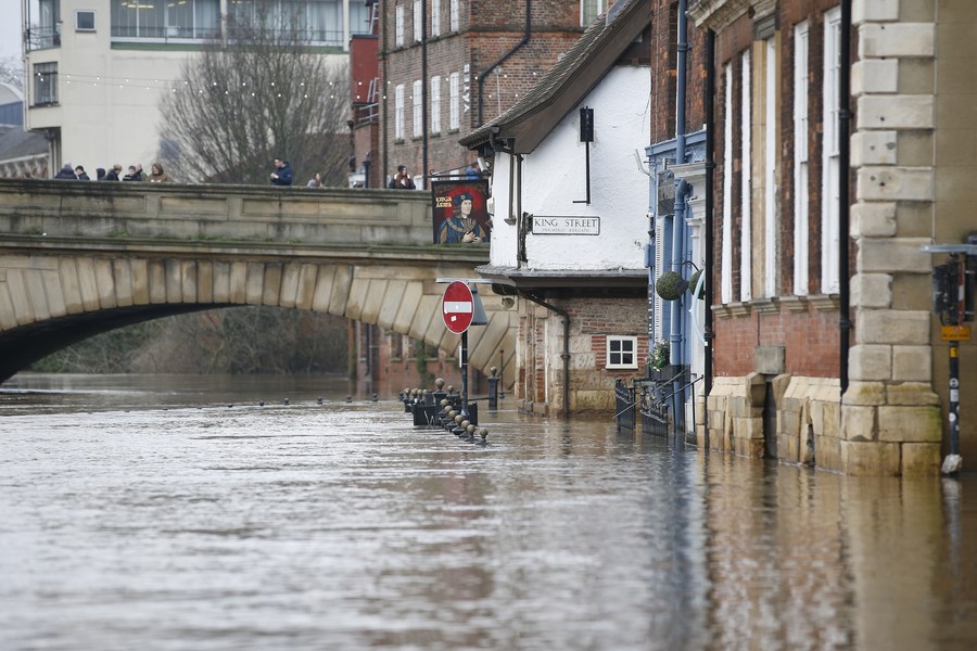 People look at a flooded area in York, Britain, on Jan. 5, 2024. (Photo by Craig Brough/Xinhua)