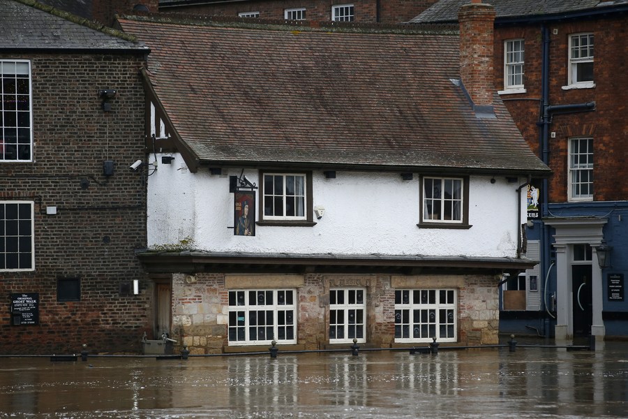 A man is seen outside a restaurant in flood water in York, Britain, on Jan. 5, 2024. (Photo by Craig Brough/Xinhua)