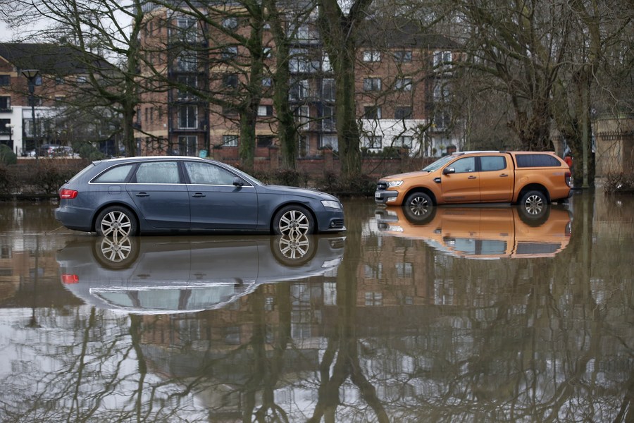 Photo taken on Jan. 5, 2024 shows vehicles in a flooded area in York, Britain. (Photo by Craig Brough/Xinhua)■
