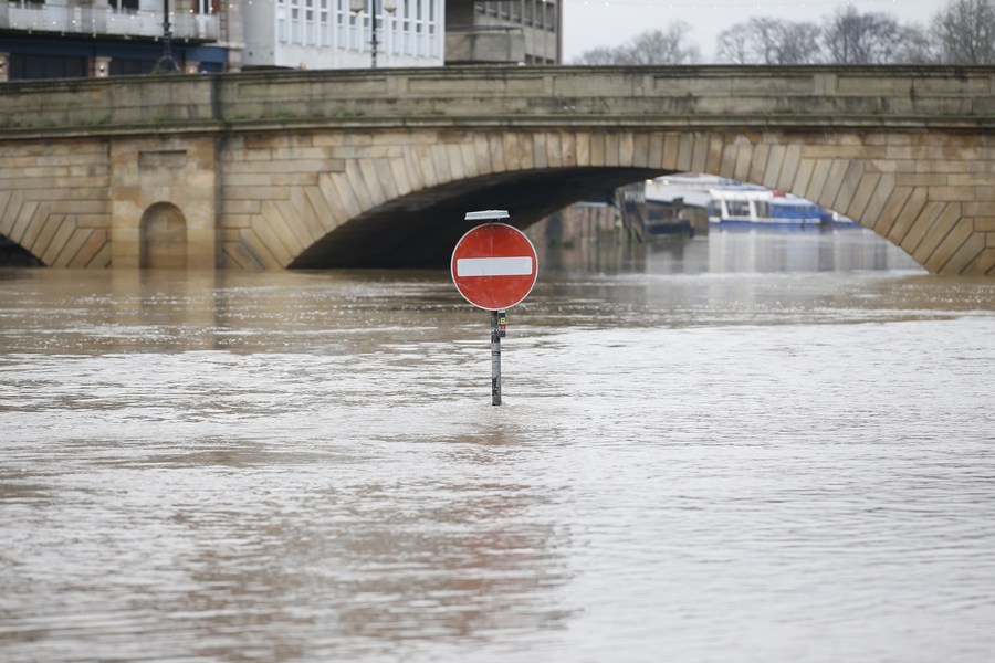 Photo taken on Jan. 5, 2024 shows a road sign in flood water in York, Britain. (Photo by Craig Brough/Xinhua)