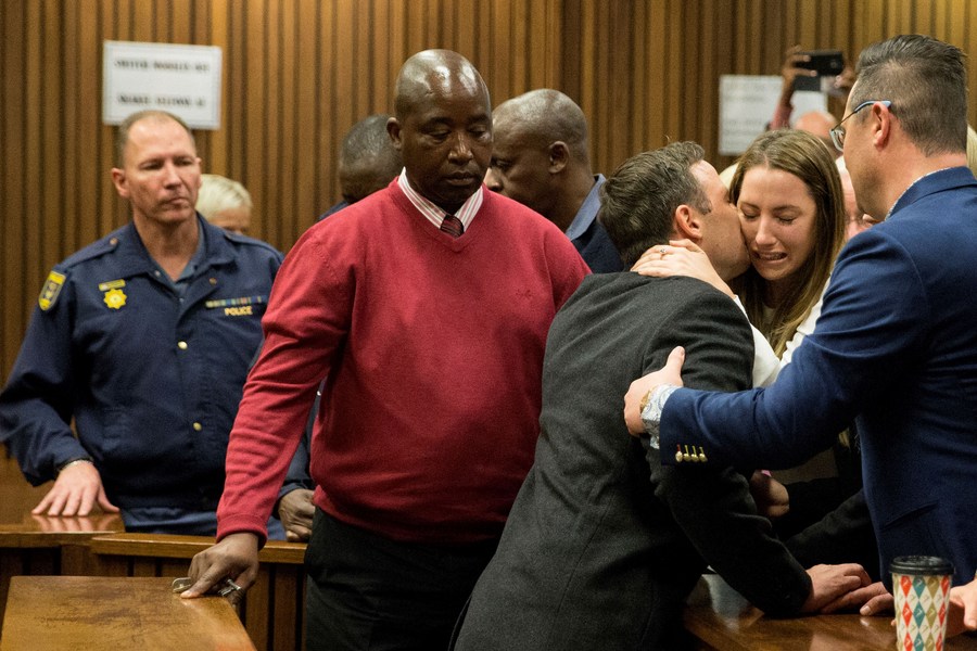 The file photo shows South African Paralympian athlete Oscar Pistorius holding his sister Aimee Pistorius (2nd R), as he leaves Pretoria High Court, South Africa, on July 6, 2016. (Xinhua/Pool/Marco Longari)