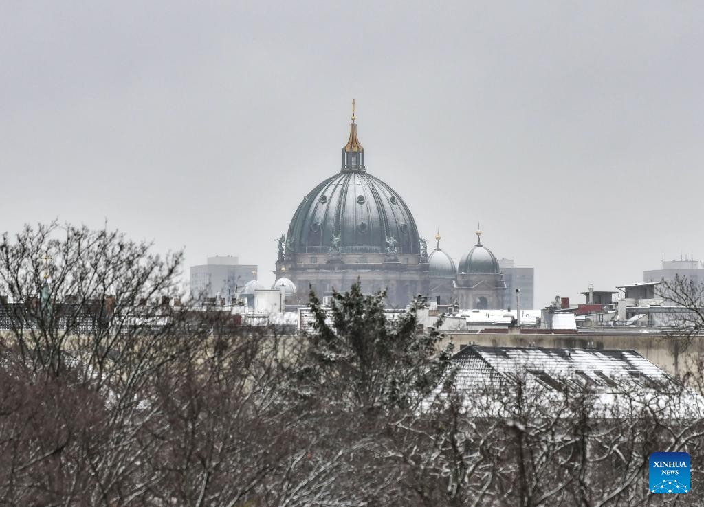 This photo taken on Jan. 5, 2024 shows the roof of the Berlin Cathedral covered by snow in Berlin, Germany. (Xinhua/Ren Pengfei)