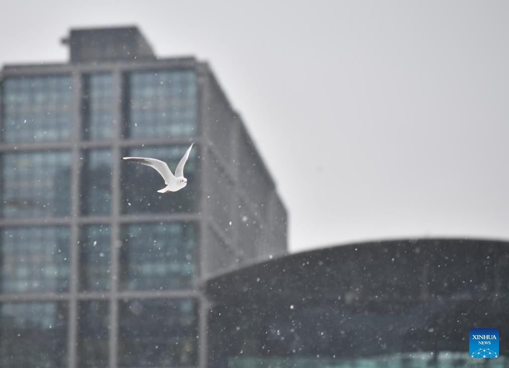 A black-headed gull flies amid snow in Berlin, Germany, Jan. 5, 2024. (Xinhua/Ren Pengfei)