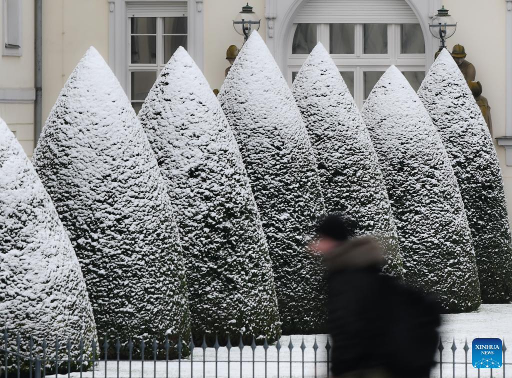 A pedestrian walks on a street in Berlin, Germany, Jan. 5, 2024. (Xinhua/Ren Pengfei)