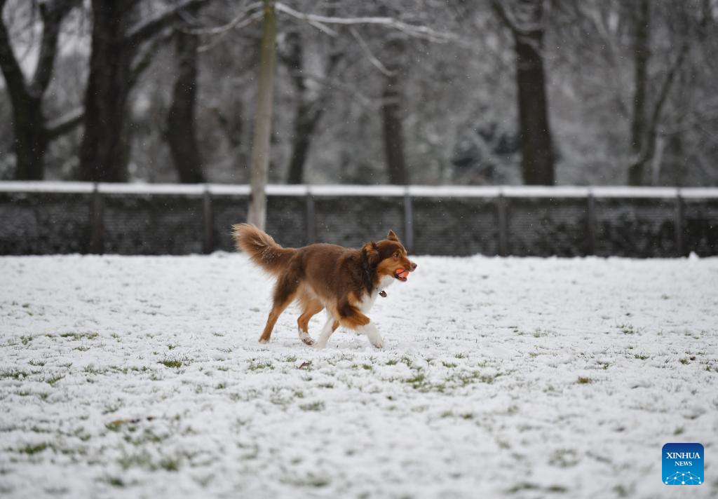 A dog plays in the snow at the Berlin Wall Memorial in Berlin, Germany, Jan. 5, 2024. (Xinhua/Ren Pengfei)