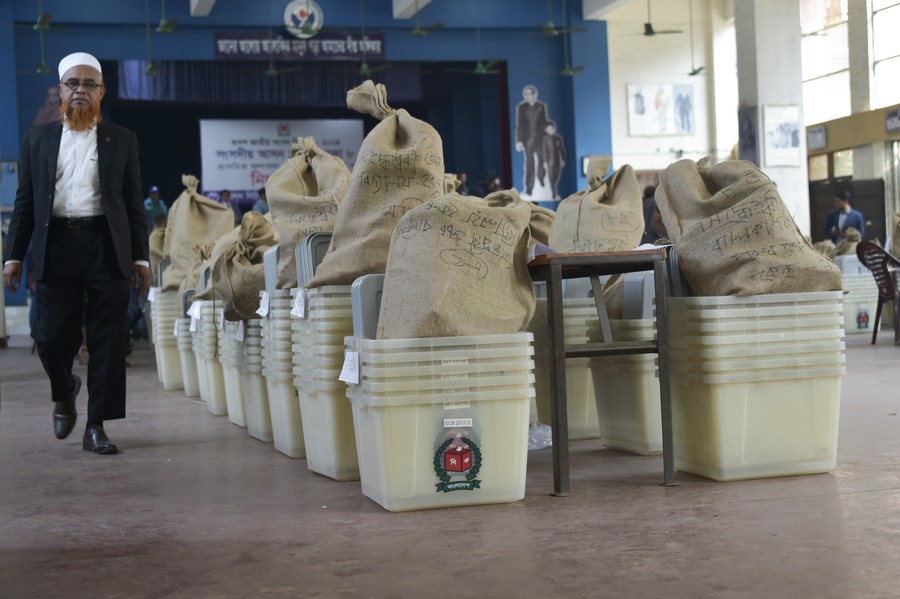 Election materials including ballot boxes are seen at a polling center in Dhaka, Bangladesh, Jan. 6, 2024. (Xinhua)