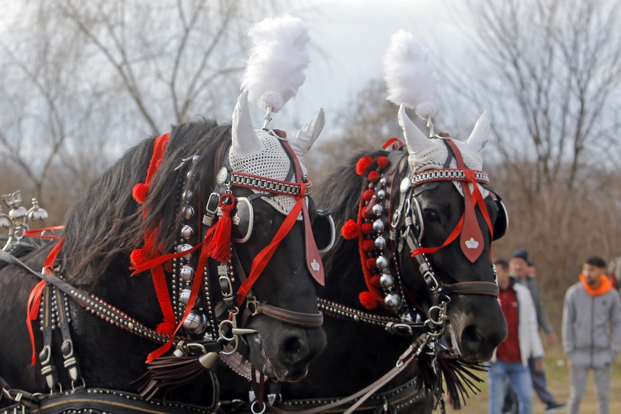 Decorated horses are seen ahead of the traditional Epiphany horse race in Pietrosani, Romania, on Jan. 6, 2024. (Photo by Cristian Cristel/Xinhua)
