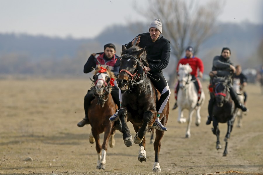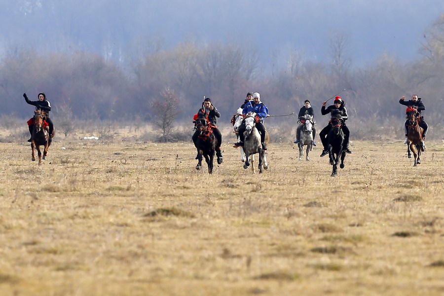 BUCHAREST, Jan. 7 (Xinhua) -- Villagers take part in the traditional Epiphany horse race in Pietrosani, Romania, on Saturday.