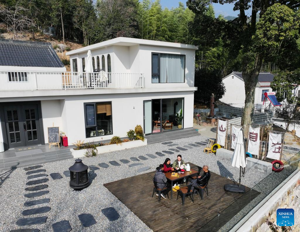 This aerial photo taken on Jan. 6, 2024 shows tourists chatting at a homestay in Tianzhu Village of Shuihou Township, Qianshan City, east China's Anhui Province. The tourist service of Shuihou Township at the foot of Tianzhu Mountain used to be limited to pure sightseeing in the mountainous areas. In recent years, the service has been diversified with the development of a number of high-quality homestays. A new business model of "snow plus homestay" has also been built based on the nearby ski resort during winter time. Homestays and other household-based tourist attractions now provide job opportunities to more than 3,000 local residents. (Xinhua/Du Yu)