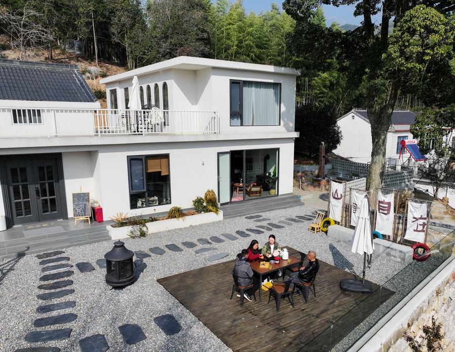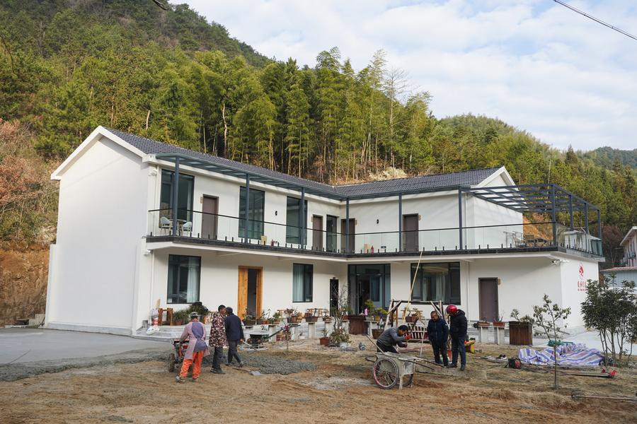 Villagers renovate a homestay in Tianzhu Village of Shuihou Township, Qianshan City, east China's Anhui Province, Jan. 6, 2024. (Xinhua/Du Yu)