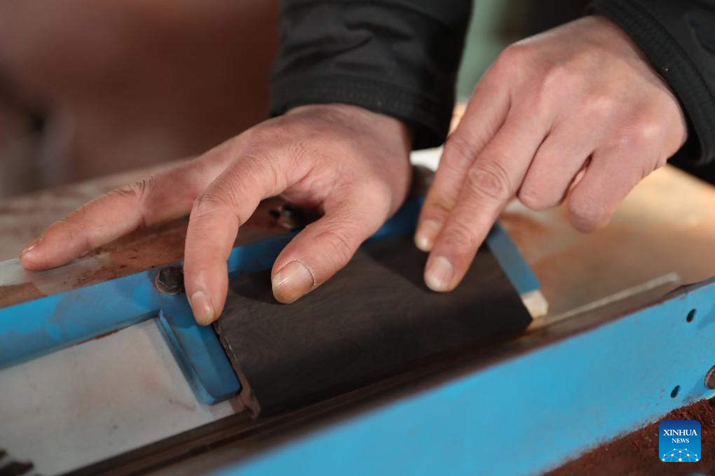 Gong Zhiguang cuts a block for erhu making in Changtu County of Tieling City, northeast China's Liaoning Province, Dec. 28, 2023.
