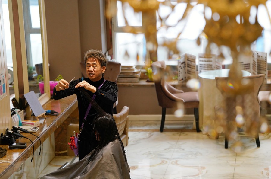 Hairdresser An Jong-euk, who is originally from the Republic of Korea (ROK), serves a customer in Urumqi, capital city of northwest China's Xinjiang Uygur Autonomous Region, Jan. 8, 2024. (Xinhua/Aman)