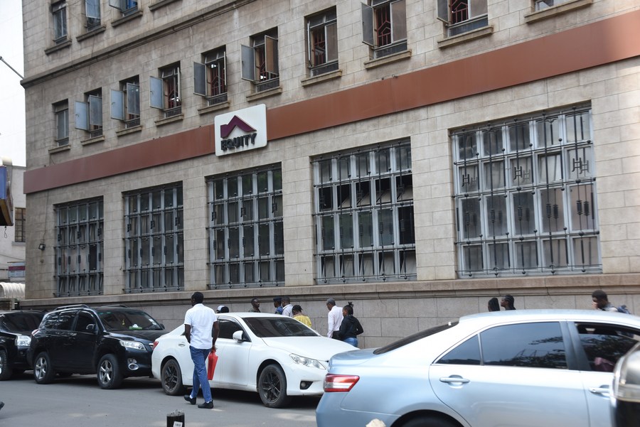 People pass near a branch of Equity Bank in Nairobi, the capital of Kenya, on June 19, 2023. (Photo by John Okoyo/Xinhua)