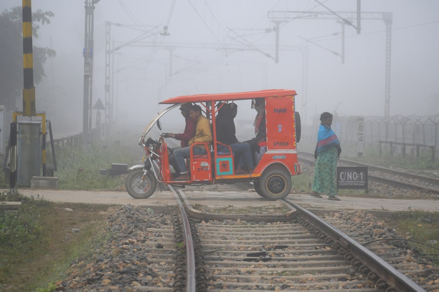 Commuters cross a railway track amid fog on a cold winter morning in Nagaon district of India's northeastern state of Assam, Dec. 12, 2023. (Str/Xinhua)
