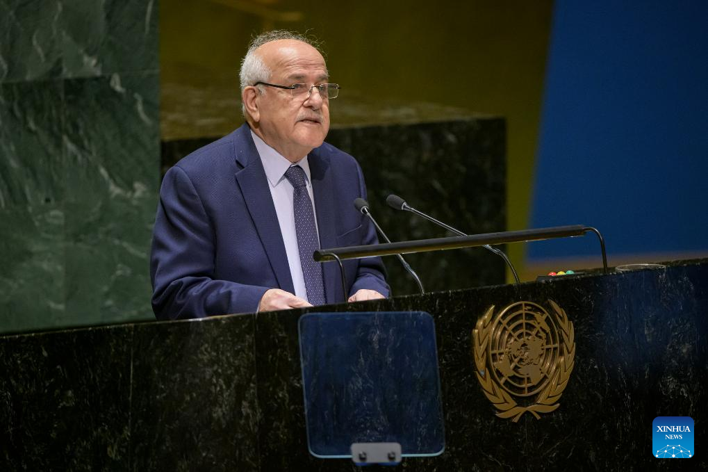 Riyad Mansour, permanent observer of the Observer State of Palestine to the UN, addresses a meeting of the UN General Assembly (UNGA) discussing the United States' veto on Gaza in the Security Council the previous month, at the UN headquarters in New York, Jan. 9, 2024. Tuesday's meeting came on the heels of the U.S. vetoing on a Russian amendment prior to the successful passing of last month's council resolution on Gaza.