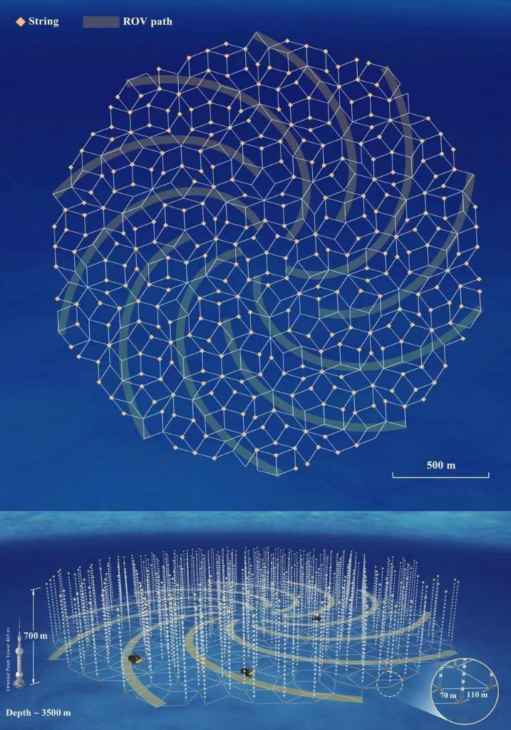 This diagram shows the underwater telescope, dubbed the Tropical Deep-sea Neutrino Telescope (TRIDENT). The telescope under construction will comprise 1,200 cables, each about 700 meters long and 70 to 110 meters apart from each other. (Shanghai Jiao Tong University/Handout via Xinhua)