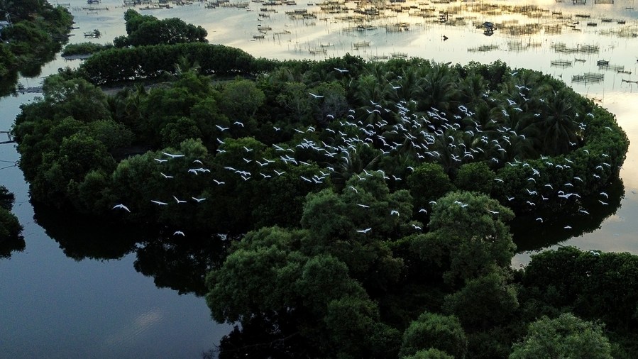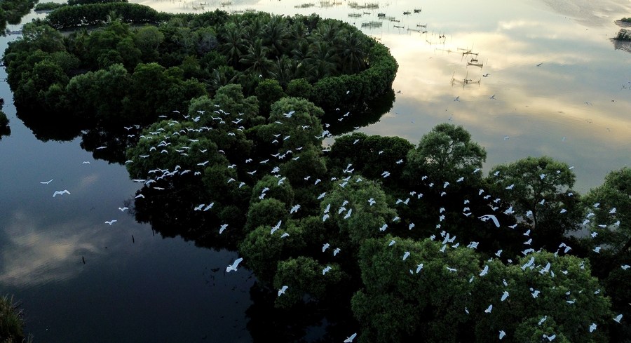 An aerial photo taken on Jan. 10, 2024 shows egrets flying over mangroves in Lhokseumawe, Aceh Province, Indonesia, Jan. 10, 2024. (Photo by Fachrul Reza/Xinhua)■