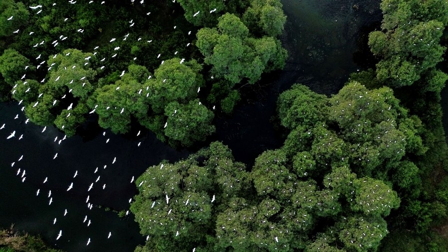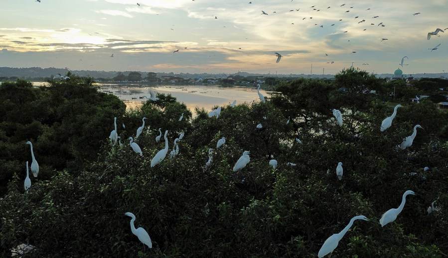 A drone photo taken on Jan. 10, 2024 shows egrets perching on mangroves in Lhokseumawe, Aceh Province, Indonesia, Jan. 10, 2024. (Photo by Fachrul Reza/Xinhua)