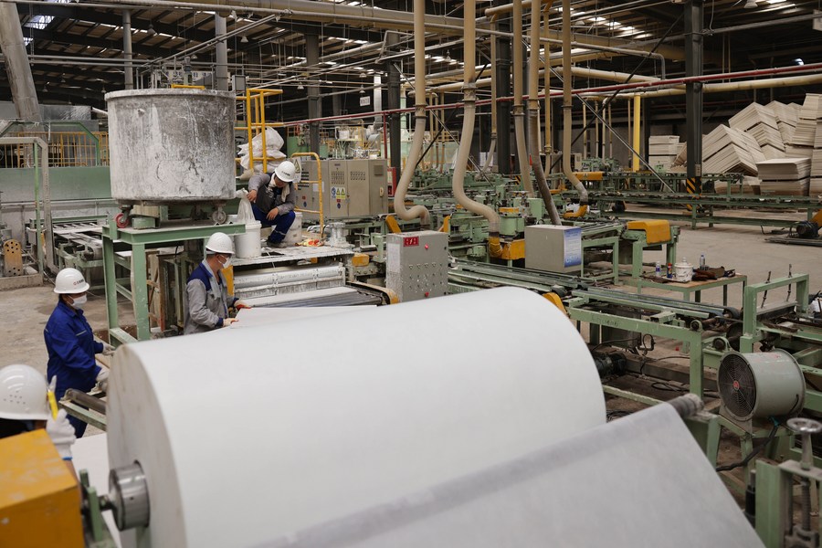 Workers work at a mineral wool workshop of a building materials company in Zhuozhou City, north China's Hebei Province, Aug. 19, 2023. (Xinhua/Luo Xuefeng)