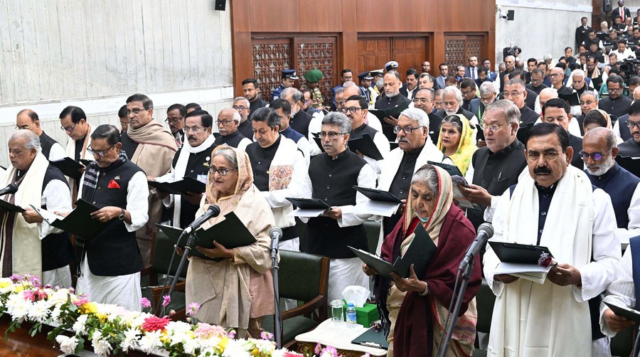 Bangladeshi Prime Minister Sheikh Hasina (3rd R, Front) takes oath as the member of parliament during a swearing-in ceremony in Dhaka, Bangladesh, Jan. 10, 2024. (Prime Minister's Office of Bangladesh/Handout via Xinhua)
