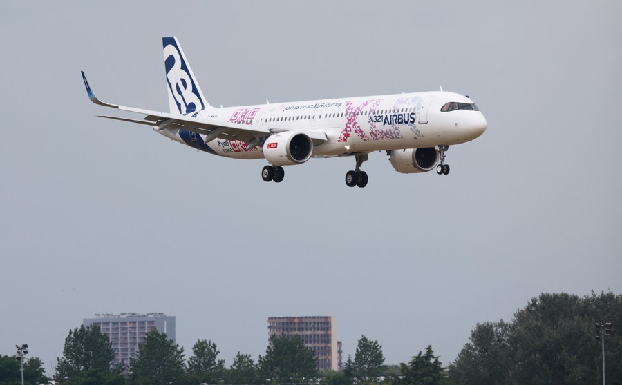 This photo taken on June 19, 2023 shows a demonstration of the Airbus A321 XLR during the 54th International Paris Air Show held at Le Bourget Airport near Paris, France. (Xinhua/Gao Jing)