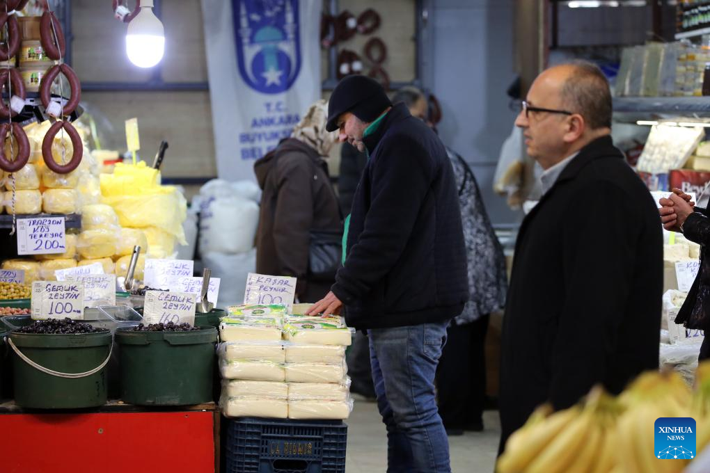People shop at a market in Ankara, Türkiye, Jan. 8, 2024. Despite the economic revamp, the inflation in Türkiye remained stubbornly high, and many consumers said their living standards continue to decline. (Mustafa Kaya/Handout via Xinhua)