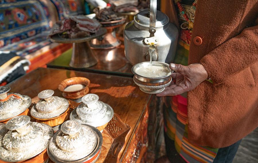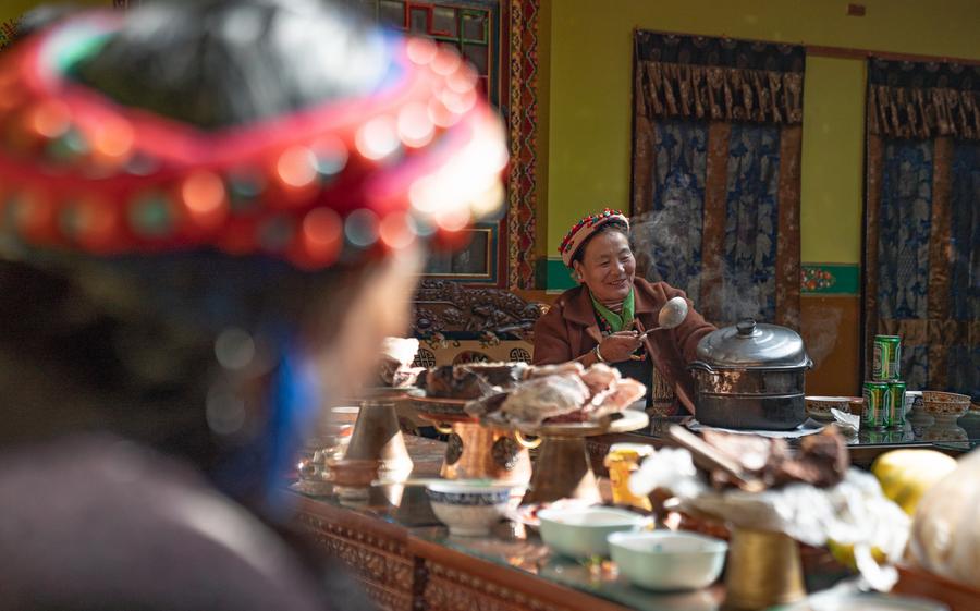 Pasang Butri's families pose for a group photo during the celebration of the farmers' New Year at their home in Xigaze, southwest China's Xizang Autonomous Region, Jan. 12, 2024. (Photo by Tenzin Nyida/Xinhua)Pasang Butri prepares cereal porridge for her family members at home in Xigaze, southwest China's Xizang Autonomous Region, Jan. 12, 2024. (Photo by Tenzin Nyida/Xinhua)