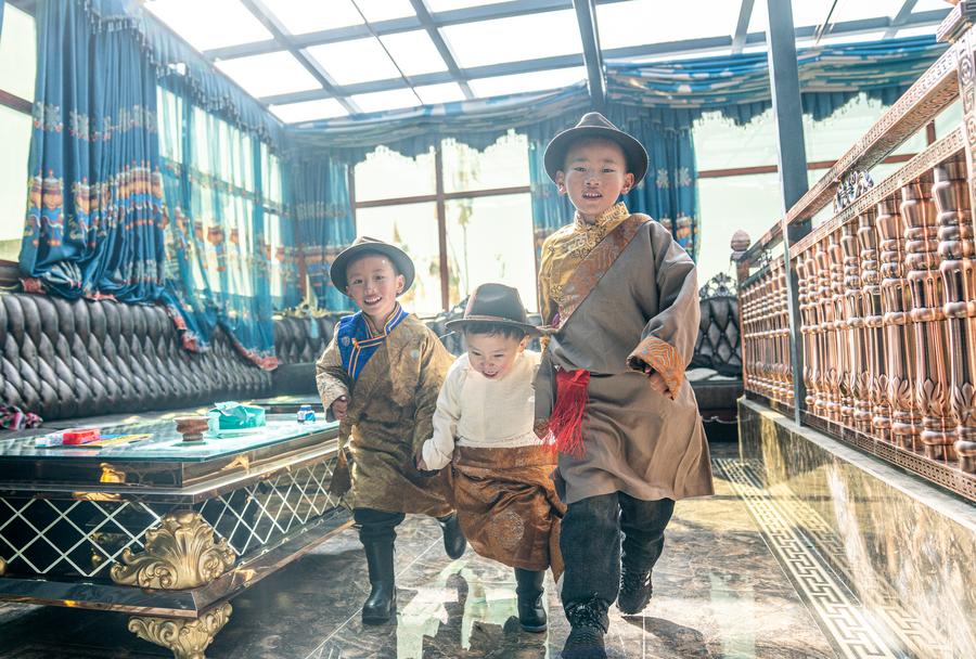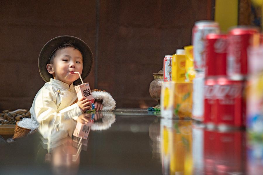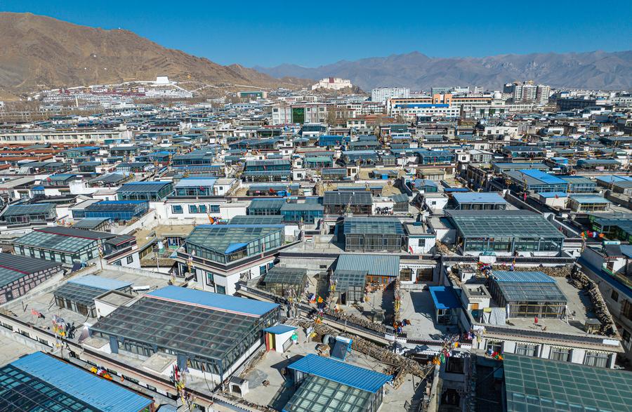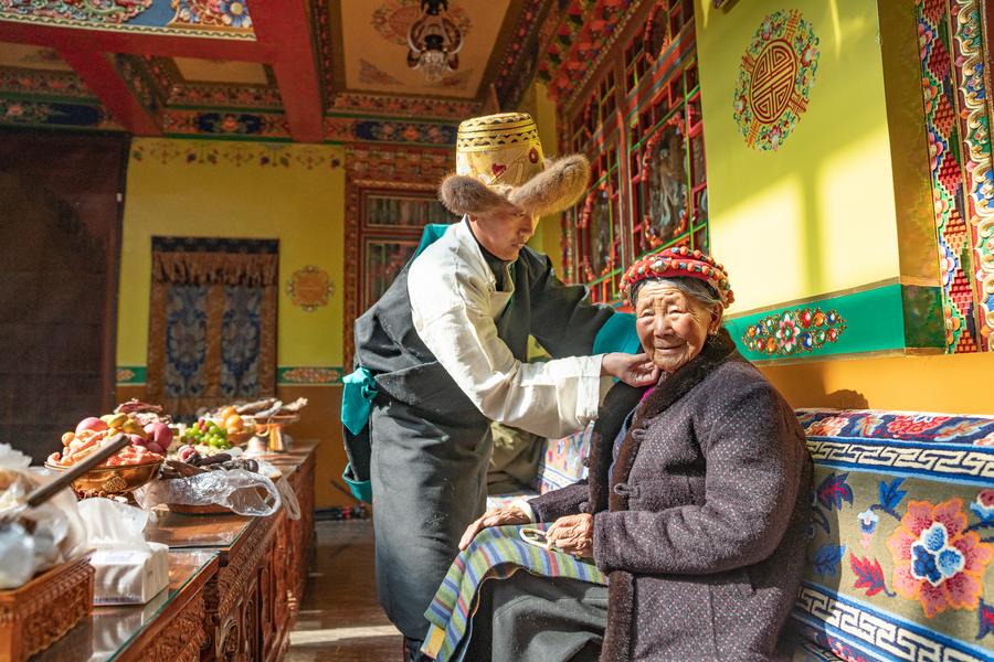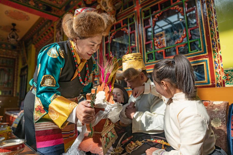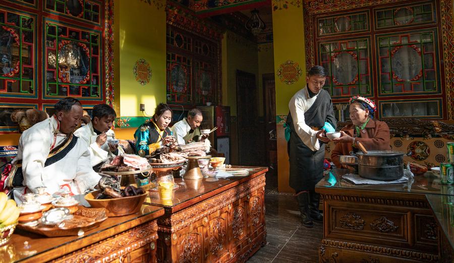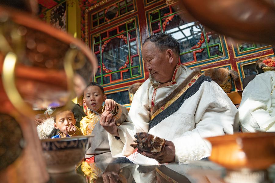 Pasang Butri's daughter Tsering Butri (1st L) prepares chema box, a rectangular wooden box containing roasted barley and fried wheat grain, for the family members at home in Xigaze, southwest China's Xizang Autonomous Region, Jan. 12, 2024. (Photo by Tenzin Nyida/Xinhua)Pasang Butri's mother (R) is pictured during the celebration of the farmers' New Year at home in Xigaze, southwest China's Xizang Autonomous Region, Jan. 12, 2024. (Photo by Tenzin Nyida/Xinhua)Pasang Butri's families have mutton during the celebration of the farmers' New Year at home in Xigaze, southwest China's Xizang Autonomous Region, Jan. 12, 2024. (Photo by Tenzin Nyida/Xinhua)Pasang Butri's grandson drinks yogurt during the celebration of the farmers' New Year at home in Xigaze, southwest China's Xizang Autonomous Region, Jan. 12, 2024. (Photo by Tenzin Nyida/Xinhua)Pasang Butri's grandsons play during the celebration of the farmers' New Year at home in Xigaze, southwest China's Xizang Autonomous Region, Jan. 12, 2024. (Photo by Tenzin Nyida/Xinhua)Pasang Butri pours highland barley wine during the celebration of the farmers' New Year at home in Xigaze, southwest China's Xizang Autonomous Region, Jan. 12, 2024. (Photo by Tenzin Nyida/Xinhua)Pasang Butri's families have cereal porridge during the celebration of the farmers' New Year at home in Xigaze, southwest China's Xizang Autonomous Region, Jan. 12, 2024. (Photo by Tenzin Nyida/Xinhua)An aerial drone photo taken on Jan. 12, 2024 shows a view of residential houses in Xigaze, southwest China's Xizang Autonomous Region. (Photo by Tenzin Nyida/Xinhua)