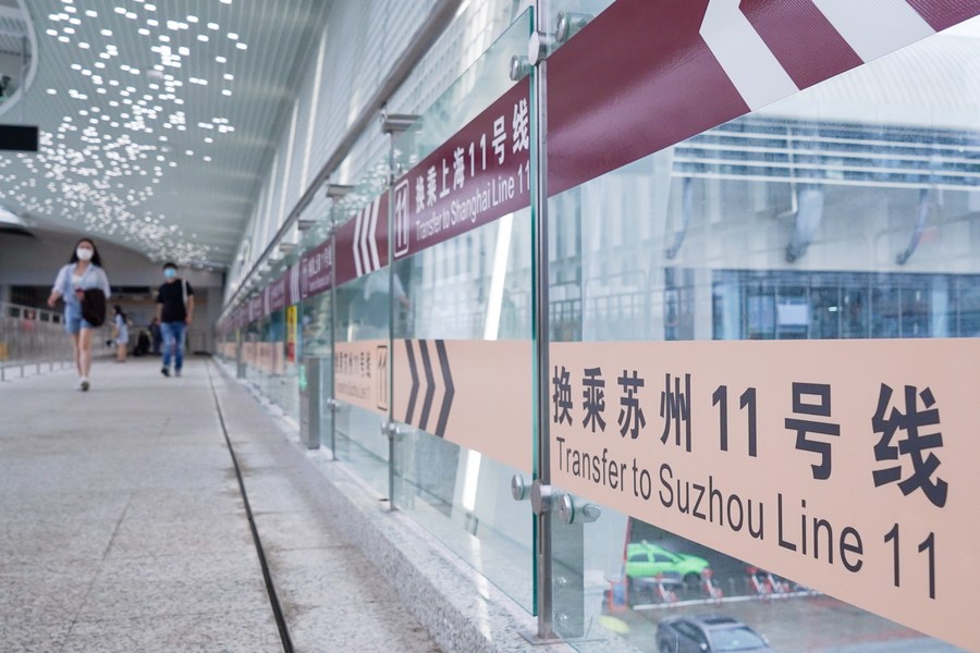 Passengers are seen at Huaqiao Station of Line 11 of the Suzhou metro in Kunshan City, east China's Jiangsu Province, June 24, 2023. (Xinhua/Li Bo)