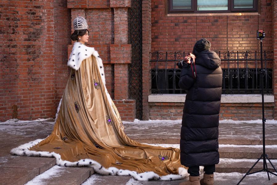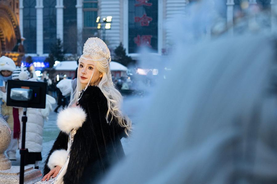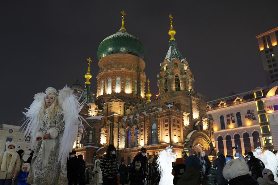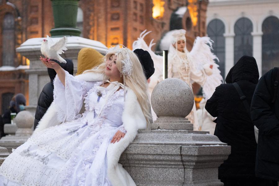 HARBIN, Jan. 14 (Xinhua) -- Harbin in northeast China's Heilongjiang Province has emerged as one of the top tourist destinations this winter. The landmark St. Sophia Cathedral, a former Russian Orthodox church, has become a hot spot for tourists. Many of them dress up in costumes to pose for photos despite the low temperature.