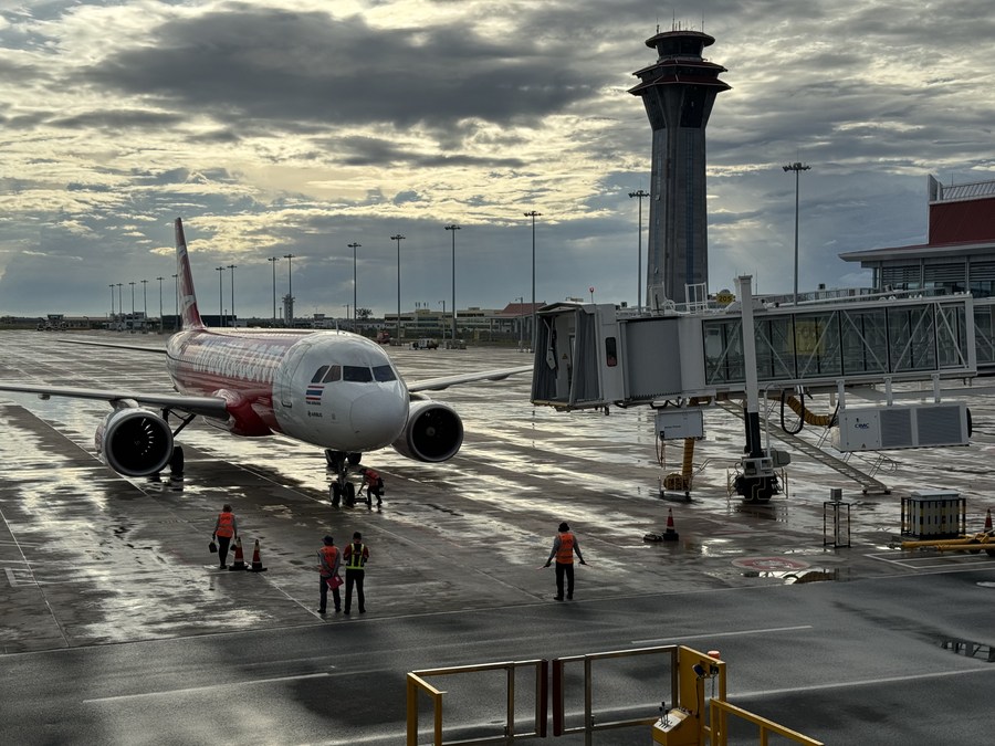 A passenger plane arrives at the Siem Reap Angkor International Airport (SAI) in Siem Reap province, Cambodia, Nov. 16, 2023. Chinese-invested Siem Reap Angkor International Airport (SAI) in northwest Cambodia's Siem Reap province is officially inaugurated on Nov. 16, 2023, raising hope for the recovery of the kingdom's tourism industry. (Photo by Liao Hongqing/Xinhua)