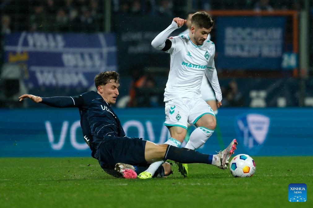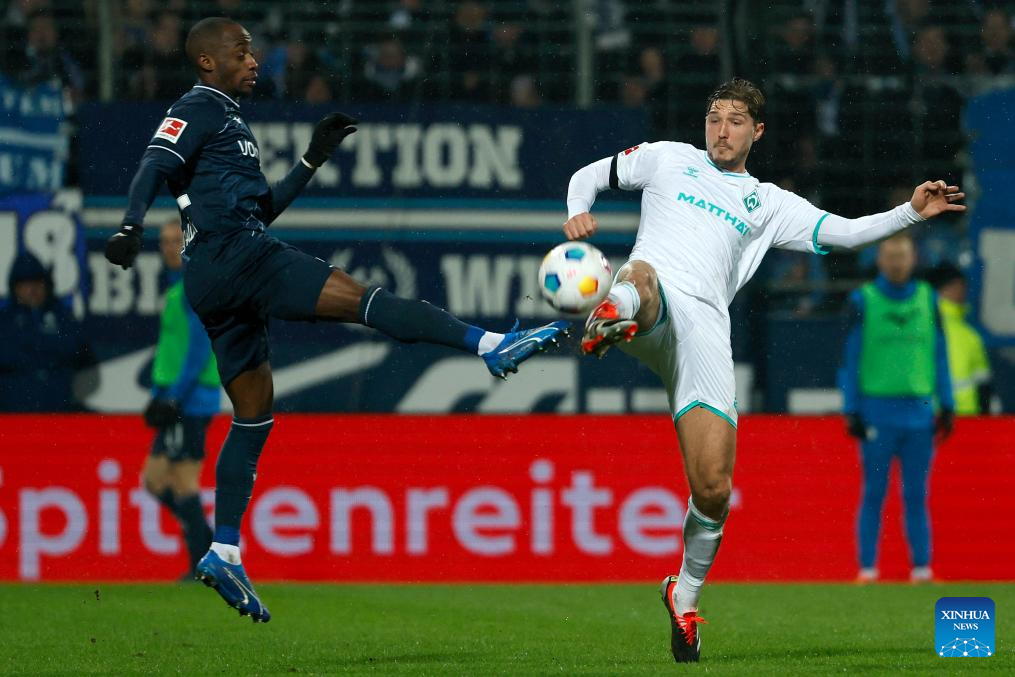 Goncalo Paciencia (L) of VfL Bochum vies with Marco Friedl of SV Werder Bremen during the Bundesliga match in Bochum, Germany, Jan. 14, 2024. (Photo by Joachim Bywaletz/Xinhua)